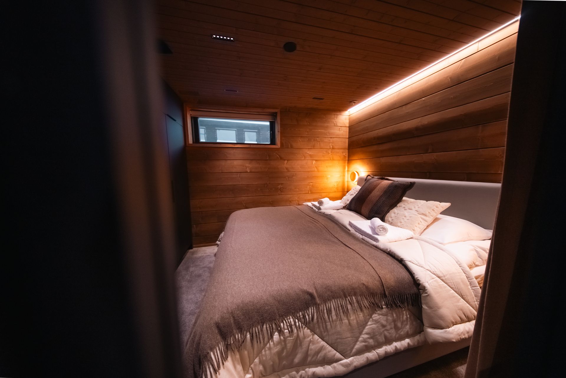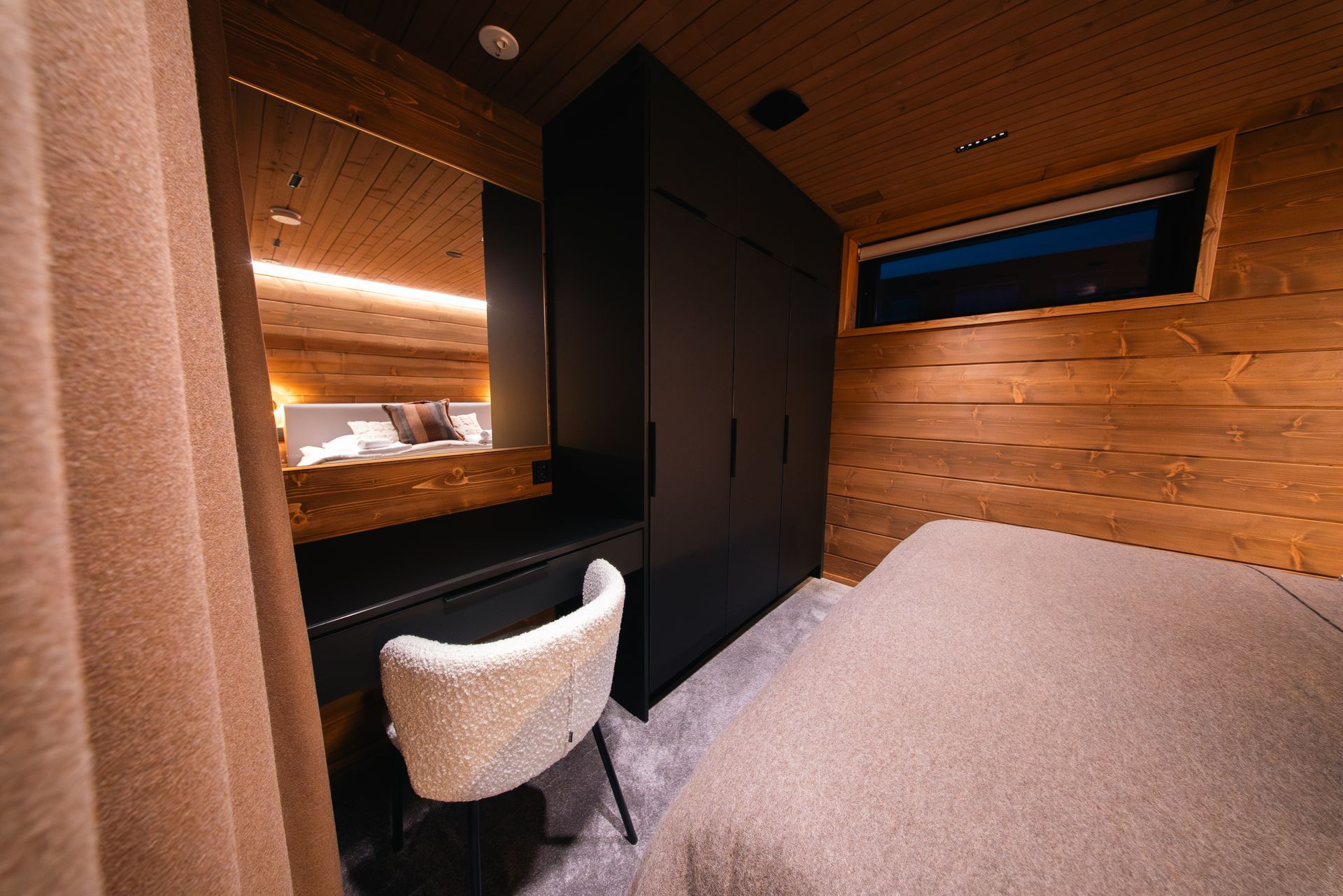 This bedroom is located on the middle floor and is furnished with a 180 cm wide, hotel-quality double bed from Unikulma.